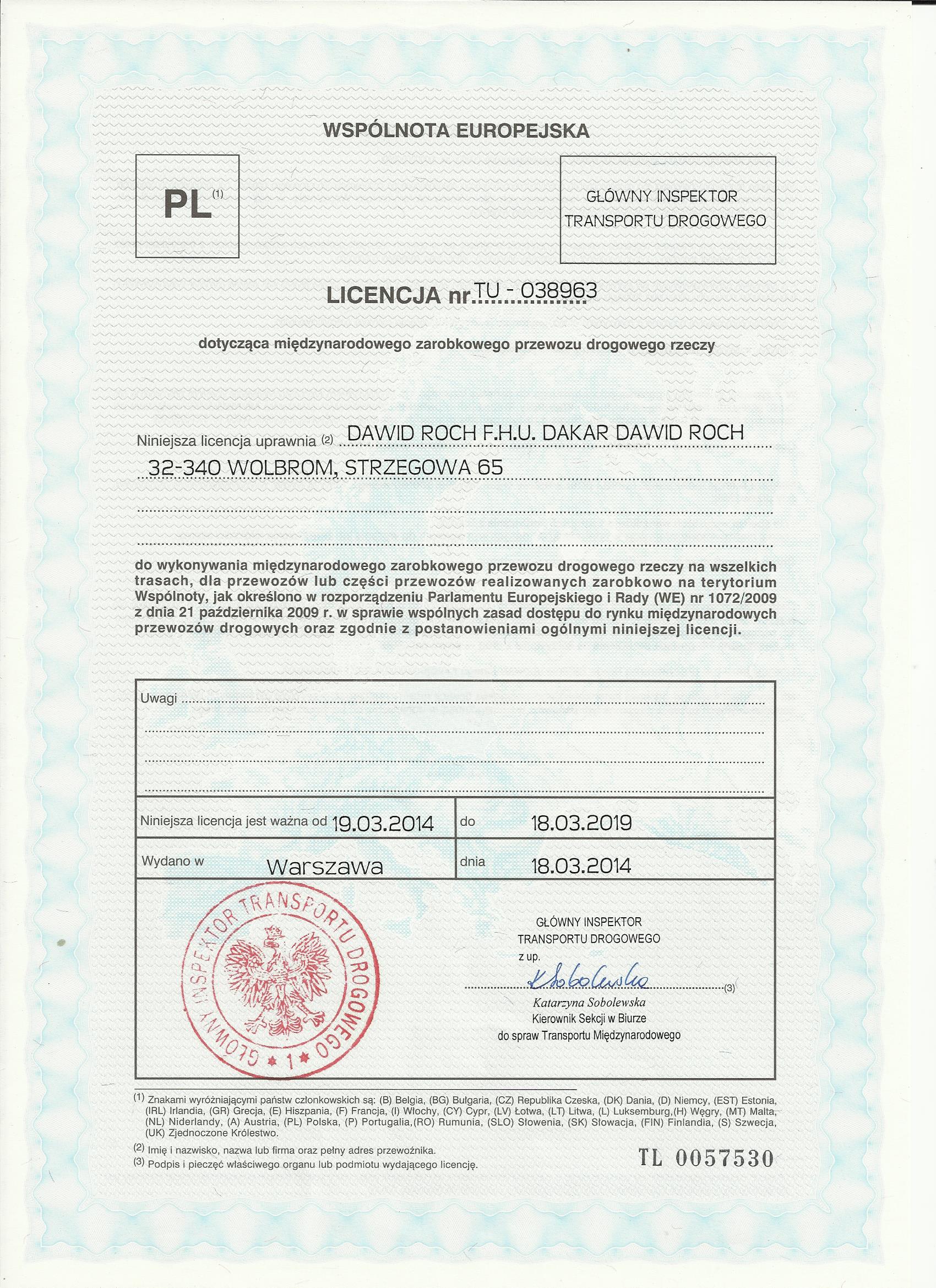 na wykonywanie transportu drogowego